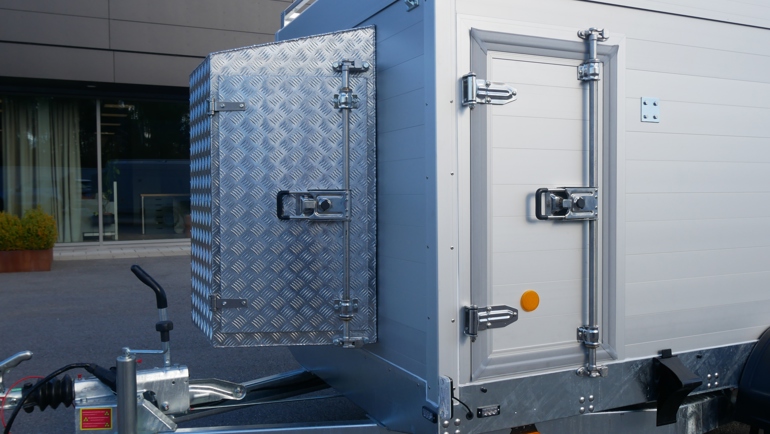 Tillverkad av 1200mm aluminiumväggar och flakmått 3000x1570mm och tillhörande utrustning efter kundspecifika önskemål med PVC-sidor, togs denna lösning fram för att få med alla verktyg och transportmöjlighet för 2st pallplatser i skåpet.
