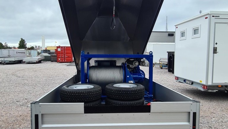 Just denna kund var på jakt efter en kåpavagn för att skydda den stora elektriska vinschen ute i fält och efter väg, samt att det var viktigt att den kunde vara operativ där den monterades bultad med genomgående bult i chassi för att kunna etableras ute i fält.