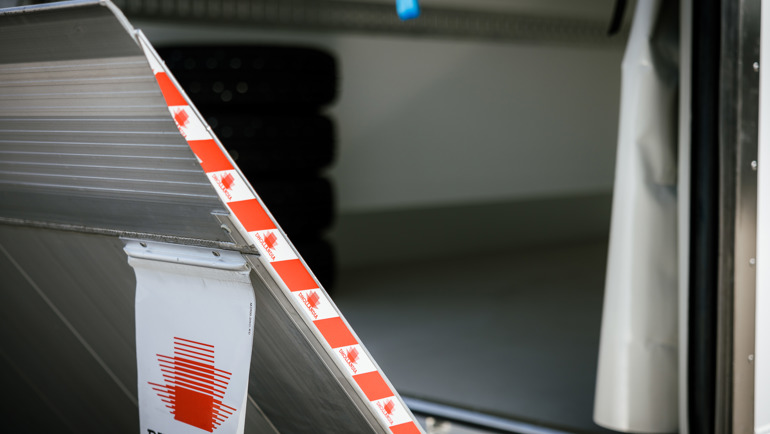 Bakgavellyften från Dhollandia styrs via kabelkontrollen i skåp alt. manöverpanelen under skåpsbyggnation i bakre del på passagerarsida, för att enkelt manövrera även parkerad efter väg.