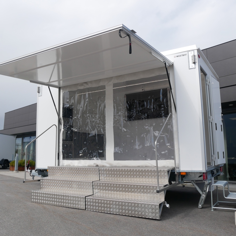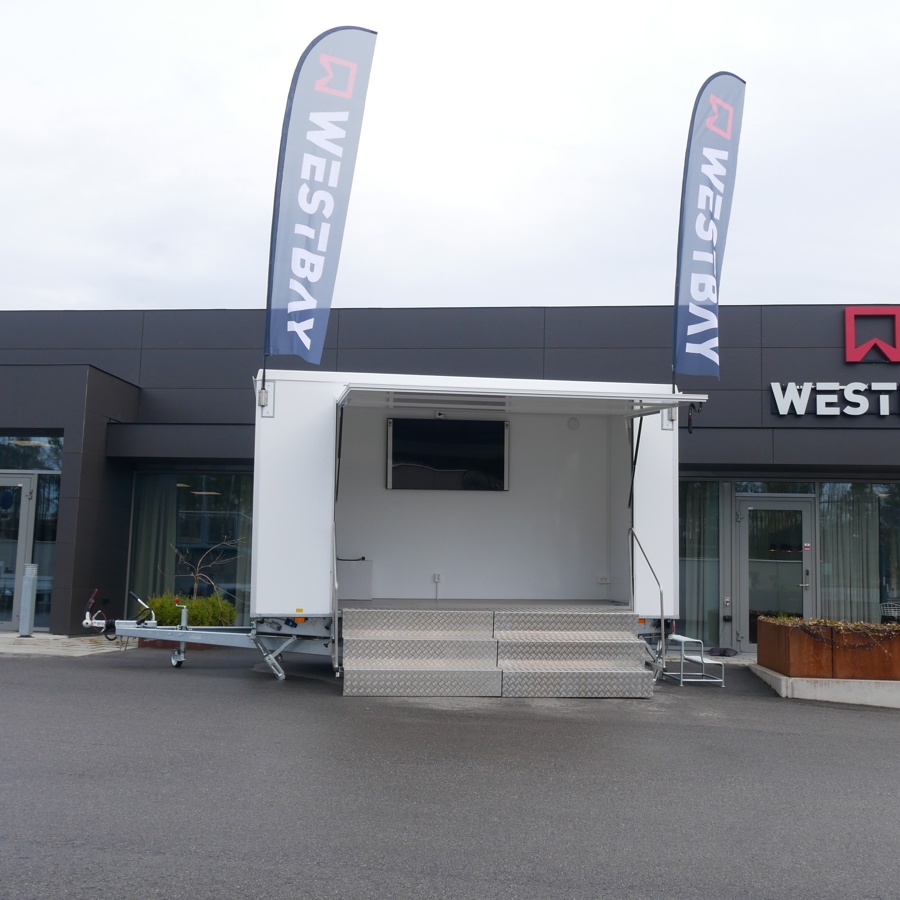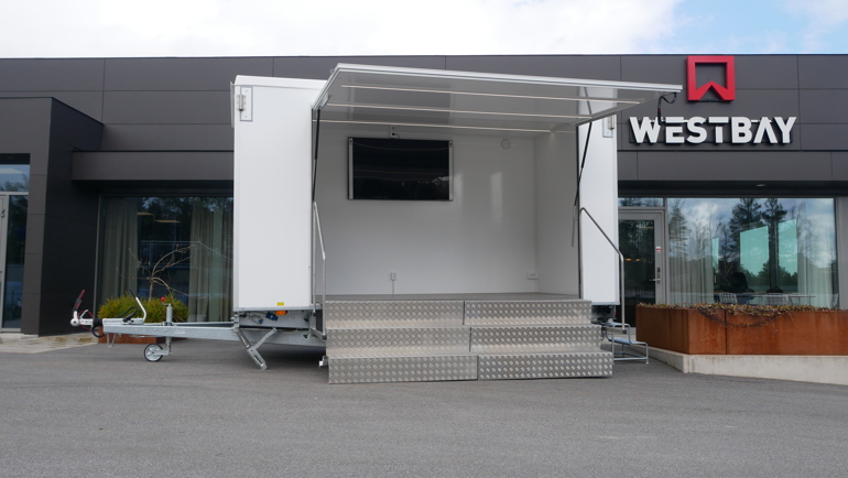 Kyldraperi hängd i takskena kombinerades med fällbara trappor för optimal och smidig etablering på mässa eller ute hos kund!