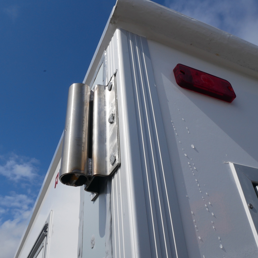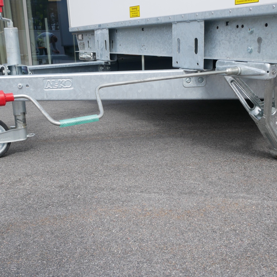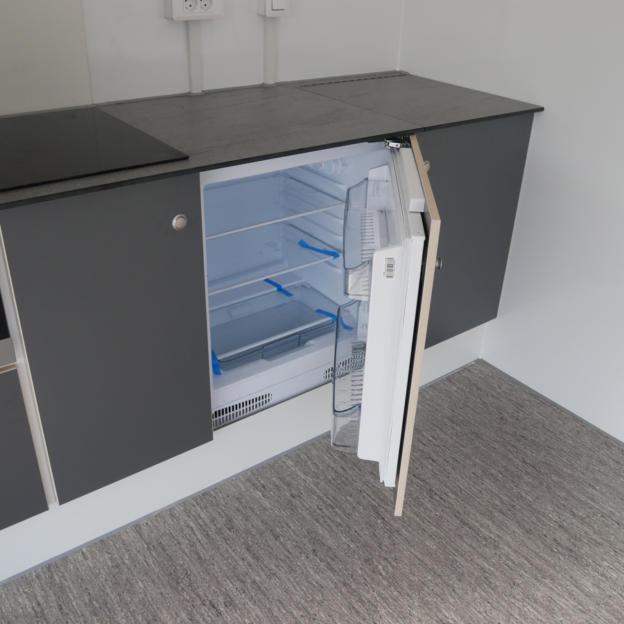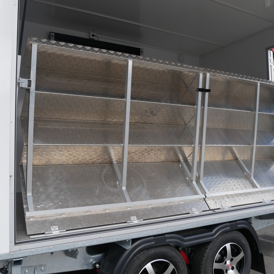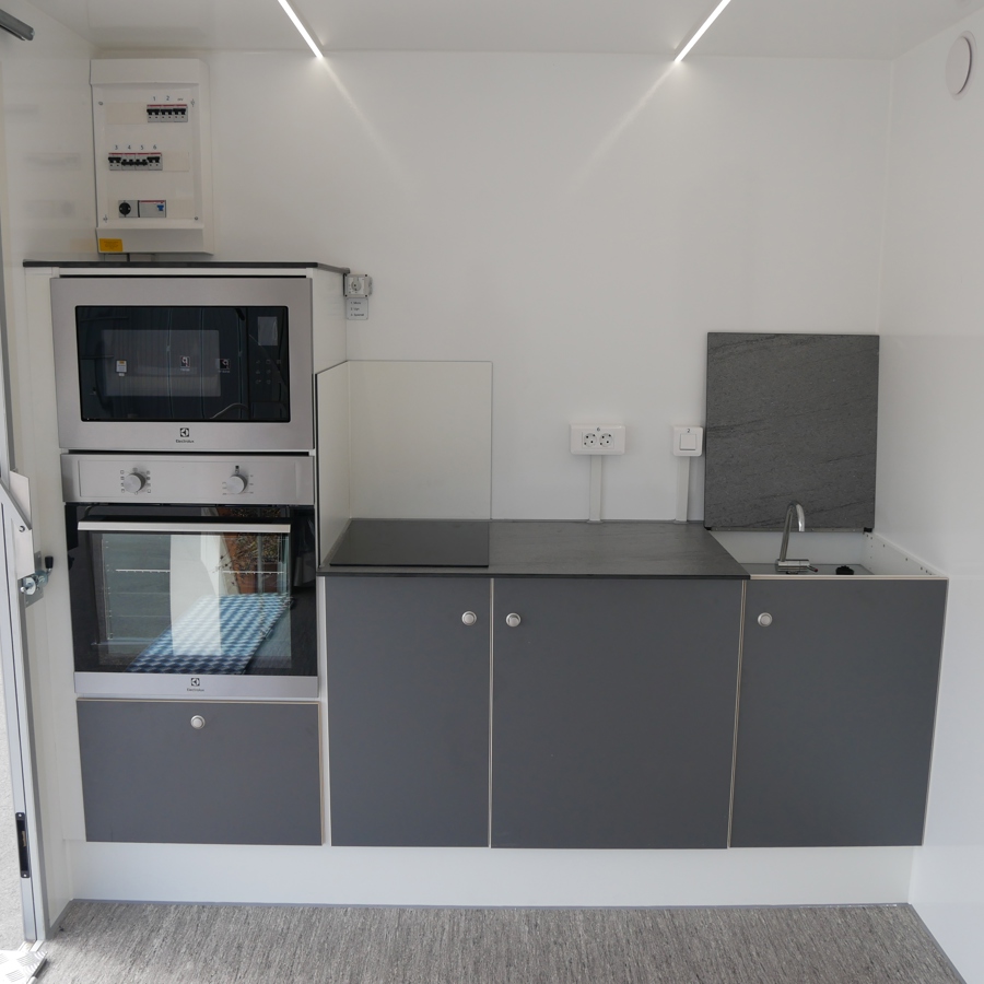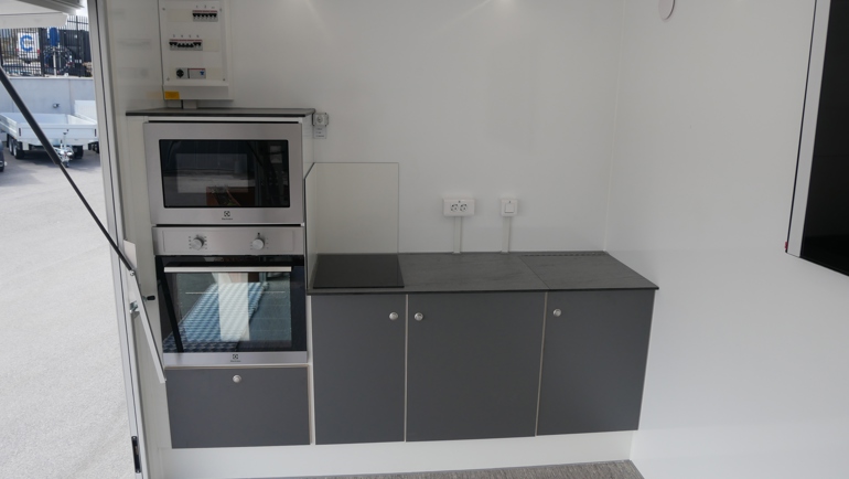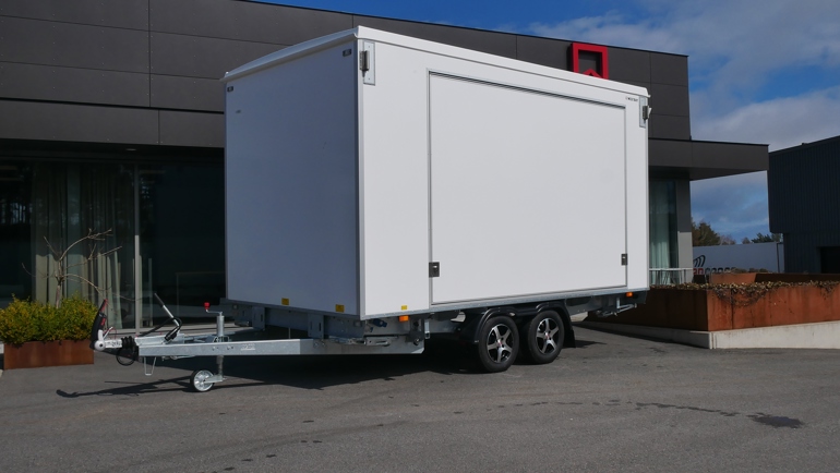I detta fall bestod förfrågan av en lagom stor mässvagn i storleken 4200x2280mm, tvåaxlat utförande för något högre komfort vid transporter, kombinerat mindre köksinredning ute i fält som bestyckades med integrerad diskho för full bänkyta när kran inte används.