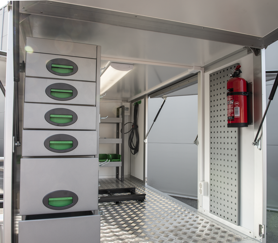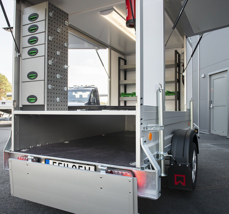 Vår skåpvagn Toolbox är den perfekta arbetskamraten och gör det möjligt att ersätta den dyra transportbussen med en mer flexibel dragbil. I vår Toolbox får du plats med alla dina verktyg och maskiner, men även det material du kan behöva på arbetsplatsen tack vare det underliggande lastutrymmet. Som tillbehör finns komplett inredning som byggs efter önskemål. Det finns även ett praktiskt elpaket med inner- och ytterbelysning samt elcentral, jordfelsbrytare och uttag. Kompressor med trycklyft eller kap- och gersåg är exempel på andra installationer vi är vana vid. Vagnen har som standard en låsbar skåpsbyggnation med tre stycken lastluckor. Under skåpets golv finns ett bibehållet lastutrymme och som standard ingår ett takräcke för att lasta längre gods som exempelvis stegar och reglar. Flera stora företag såsom NCC, Hydroscand och Mockfjärds har valt att gå över till en Toolbox. Du hittar ett antal möjliga tillval under "Bygg Ditt Släp" men du kan där också fylla i särskilda önskemål på anpassningar.